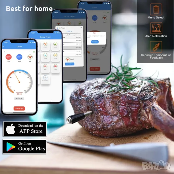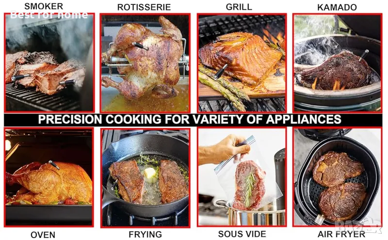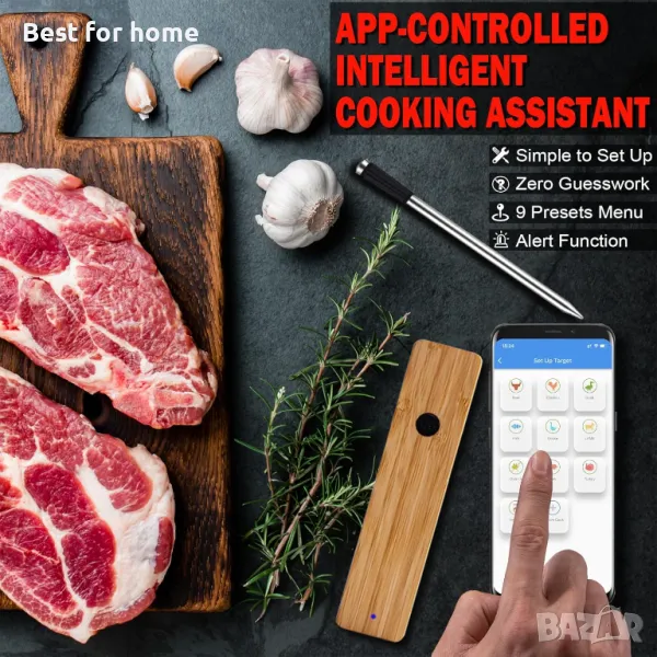 Барбекю Термометри за месо Безжичен интелигентен термометър за храна за печене на скара 80 m Long Range Bluetooth сонда за термометър за месо Цифров термометър за готвене за фурна Smoker Grill Rotisserie Подаръци за деня на майката