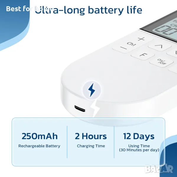 Супер дълги работни часове Устройството Liorque Tens има вградена мощна литиева батерия, която се нуждае само от 2 часа за пълно зареждане и може да се използва в продължение на 12 дни по 30 минути на ден след пълно зареждане. С напълно автоматична и интуитивна програма за масаж и LED екран с висока разделителна способност, данните се четат ясно