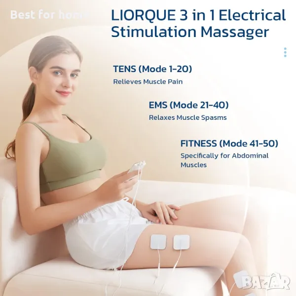 Устройство за електрическа стимулация 3 в 1 Liorque Tens Ems Fitness Устройство 3 в 1 може да облекчи болката и мускулните спазми, причинени от различни състояния като артрит, болки в коленете, болки в гърба, мускулни увреждания и др.