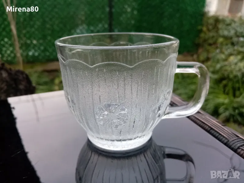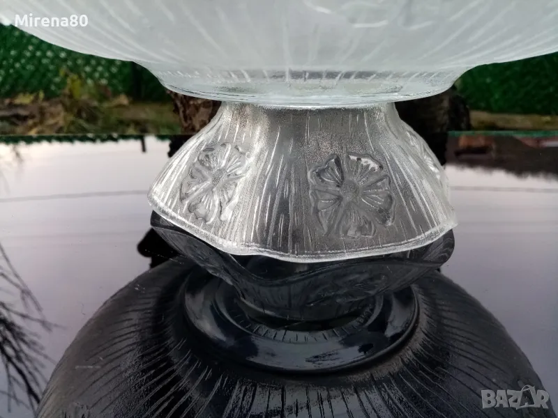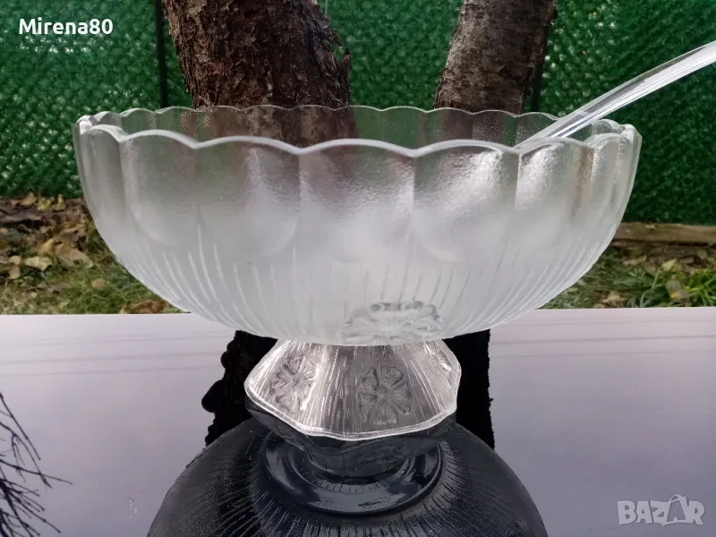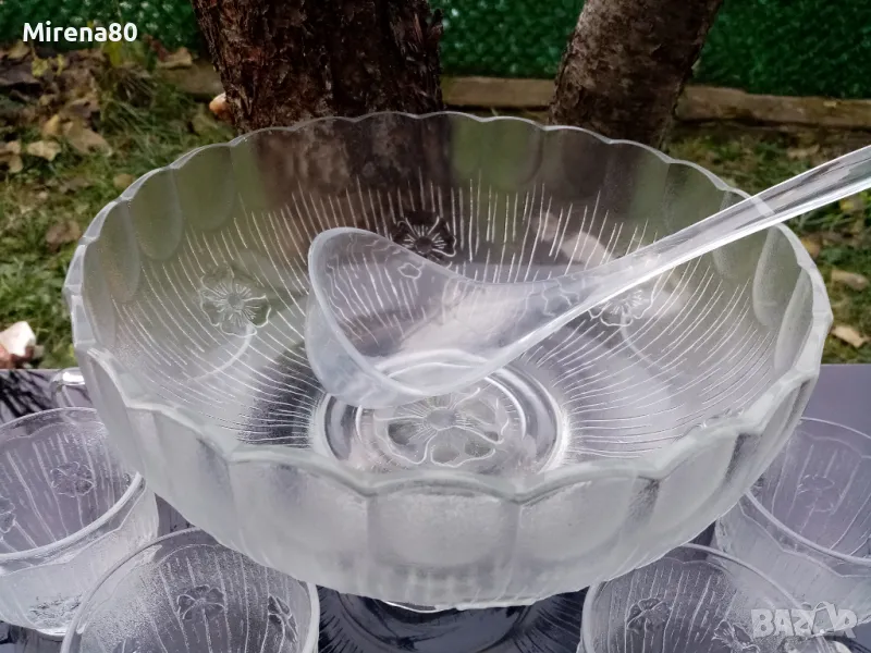 Старо италианско релефно стъкло от 60-те години - модел PRIMAVERA на производителя A. Masserini. Много красив ! Голяма купа на пиедестал (става и за огромна фруктиера) - вместимост над 3 литра + 6 чаши (180 мл) + пластмасов черпак. Отлично състояние !