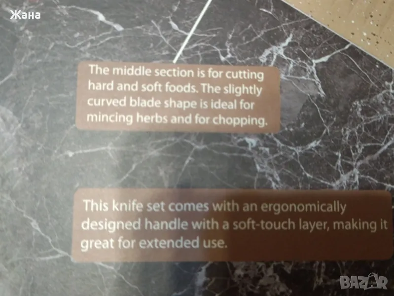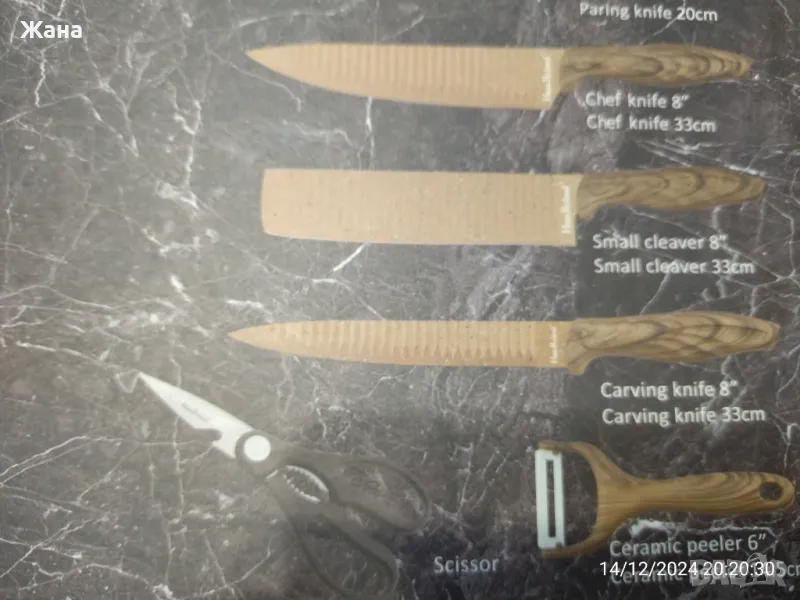 Комплекта е от 3 ножа от 33см., керамична белачка и ножица за рязане, за ядки и отварачка.