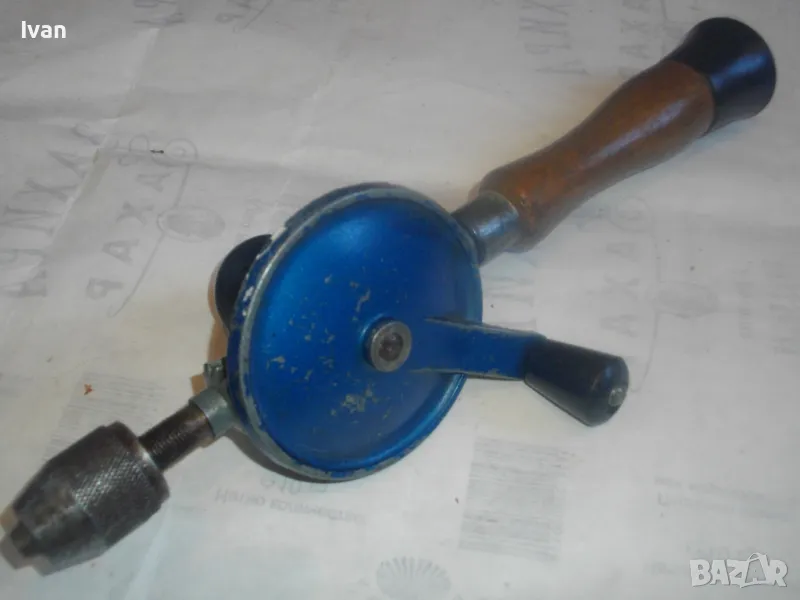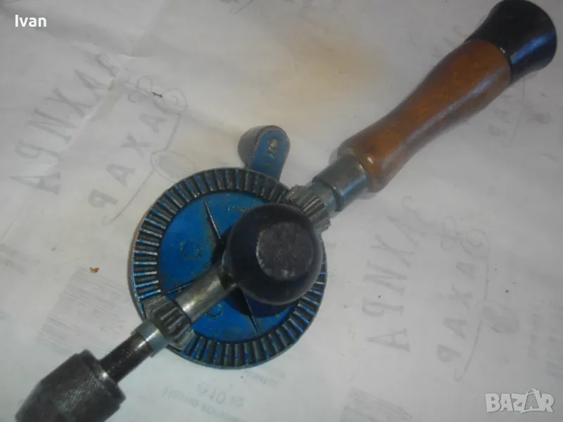 ОПИСАНИЕ на ръчен немски маткап ръчна дрелка-бормашина - цена 99 лв. Старо качество масивен истински инструмент. Цялостна дължина -310 мм. Вградено място за съхранение на бургии в дръжката. Маркировка на инструмента -Pat. № 476792 . Почти нова - отлична - захват - ф8мм. Дървена масивна и удобна за работа дръжка с вградено място и капачка оригиналнасъщо дървена. В кухината на дръжката се съхраняват бургии и свредла. Странична дръжка къса също дървена. Върток и маховик зъбно колело - алуминиеви. Патронник стоманен самонатягащ със захват до ф 8 мм. По маховика и двете зъни колела, осъществяващи движението при работа няма никакво износване на зъби. Твърда цена на инструмента - 99 лв.