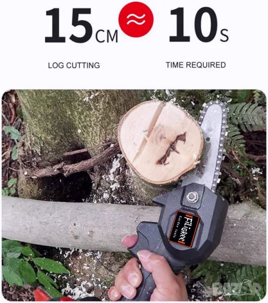 Акумулаторен верижен трион с дъска на рязане 6 инча. Висока ефективност. Можете да отрежете за около 10 секунди дървена греда с диаметър 15 cm. в зависимост от действителния размер и твърдост на дървесината.