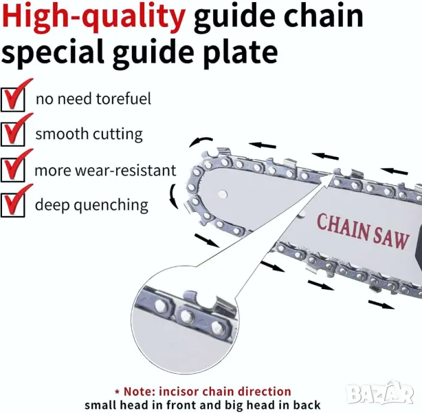 Не е необходимо да инсталирате веригата отделно. Направляващата дъска може бързо да разнася топлината която се образува при рязане, защита от претоварване и е много устойчива на падане и износване.