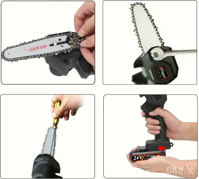 Всеки може лесно да го използва, не е уморително за дълго работно време. Трябва само да използвате гаечния ключ, за да завъртите винта и да регулирате веригата, и накрая да затегнете винта.