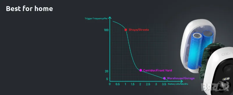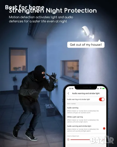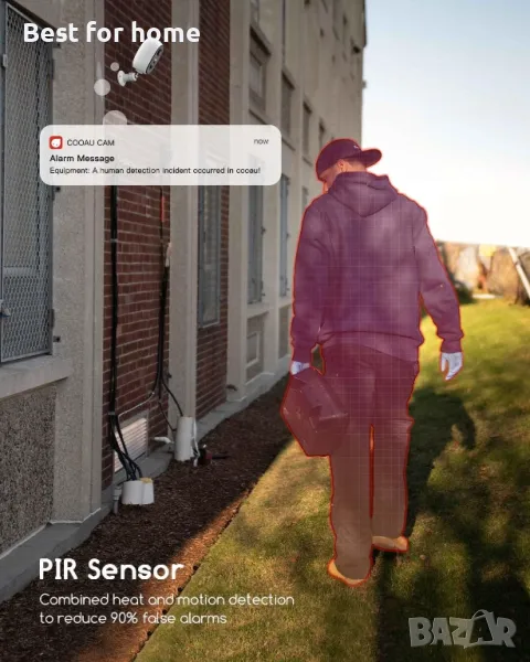 PIR откриване на движение и аларма в реално време: Усъвършенстваният сензор на Sony и технологията за откриване на хора позволяват на външната охранителна камера да открива движенията на тялото по-интелигентно. Не забравяйте да ви предупреди незабавно, когато някой се приближи, независимо къде се намирате. Можете да видите изгледа в реално време и да говорите с него/нея директно през високоговорителя (или просто да го/я изгоните).