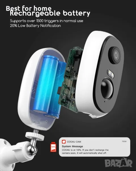 100% безжична и акумулаторна батерия: Безжичните външни камери COOAU ви помагат да кажете сбогом на досадните кабели и честото зареждане. Акумулаторна батерия, използвана от автомобили Tesla, тази WiFi камера поддържа 3 ~ 6 месеца дългосрочна употреба след пълно зареждане. Моля, заредете го напълно, когато го използвате за първи път.