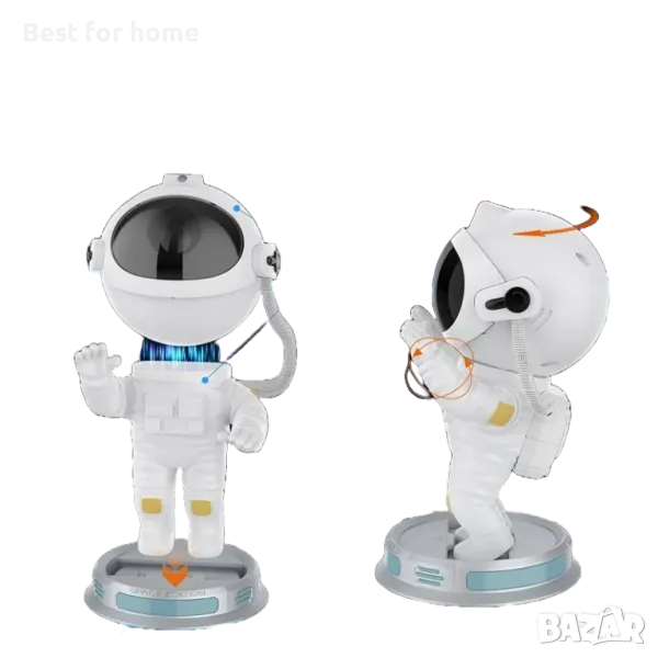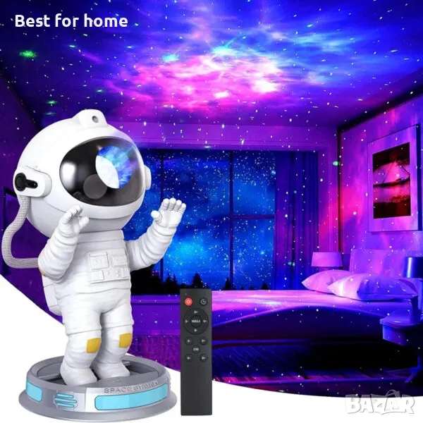 Превърнете всяко пространство в космическо чудо с нашия проектор Astronaut. Осветете заобикалящата ви среда с хипнотизиращи ефекти на мъглявини, включващи звезди и галактики, които могат да се използват поотделно или комбинирани за зашеметяващ небесен дисплей. Различни светлинни ефекти могат да се превключват чрез дистанционно управление.