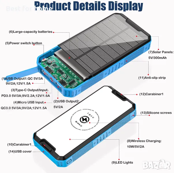 Соларно зарядно за мобилен телефон, което може да осигури мощно максимално безжично зареждане с мощност от 10 W. С технологията Qi слънчевата батерия е съвместима с всички устройства, поддържащи Qi. С 2 USB порта и 1 входно/изходен порт Type-C и 1 микро входен порт, той може да зарежда поне 4 устройства едновременно. Идеален за резервни батерии, особено подходящ за любители на спорта на открито. - Това соларно зарядно за мобилен телефон има вградени 36 LED светлини, 4 режима, мощни функции, дълъг живот на батерията; 4 режима на работа: силен, среден, мигащ, SOS. Може да ви помогне да изпратите авариен сигнал, идеален за къмпинг на открито, приключение на открито, ремонт на автомобили, поддръжка, машинни инструменти, склад, машинни помещения, строителство, ежедневни спешни случаи и други случаи.