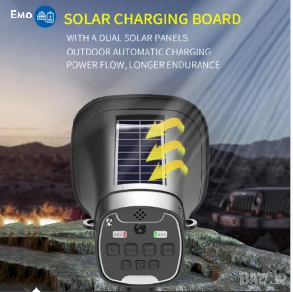 Има вградени соларни панели, които позволяват зареждане на батерията от слънчева светлина, правейки го изключително удобен за дълги излети на открито.