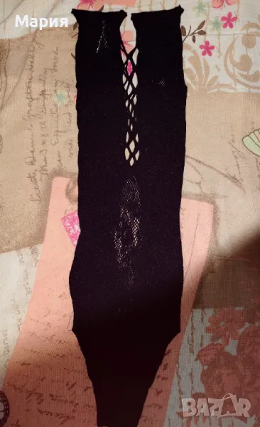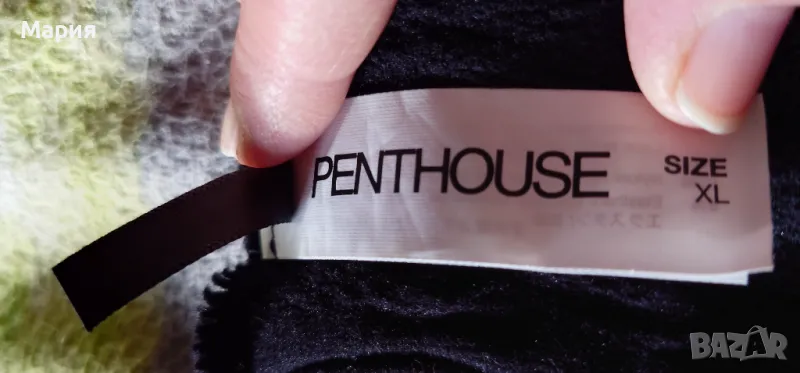 Продавам боди с дълбоко и V-образно оформено деколте. Моделът е изработен от мека и еластична, мрежеста материя, размер XL, но е подходящ и за по-слаба фигура. Артикулът е на марка Penthouse. Декориран е с флорални мотиви и кръстосани, тънки ленти. На гърба има голям отвор. Бодито няма закопчаване и не е носено.