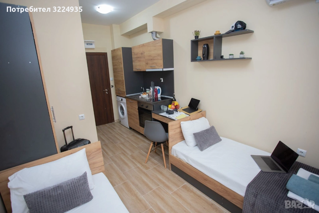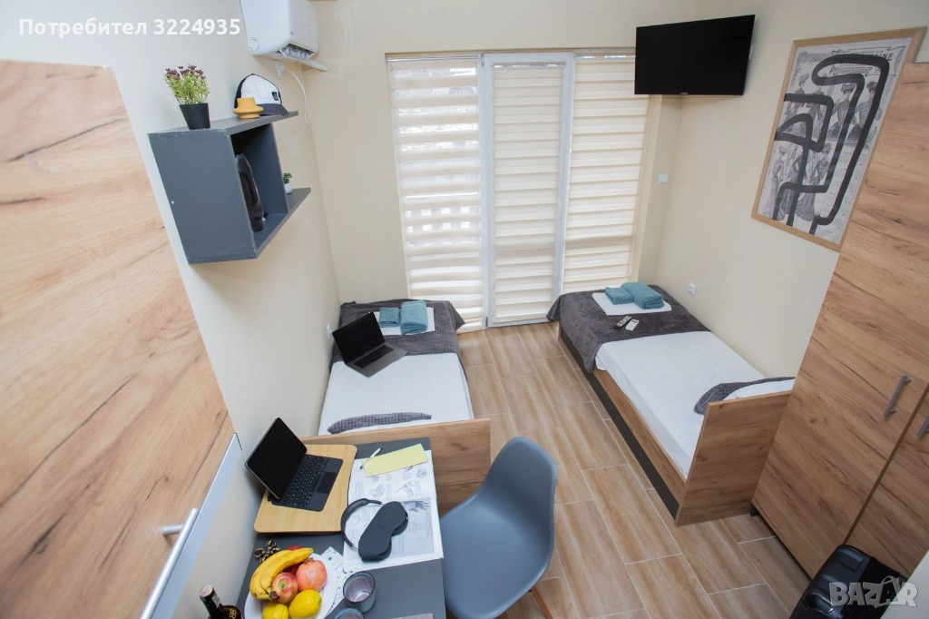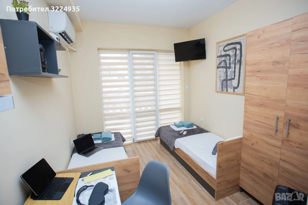 Пълно обзавеждане: две легла, гардероб, бюра, столове и др.