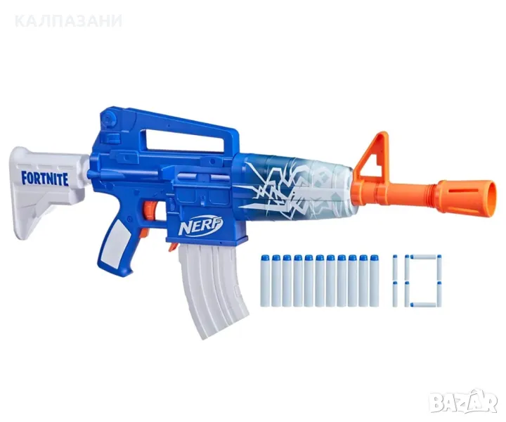 Бластерът Nerf Fortnite Blue Shock е вдъхновен от оборудването, използвано във Fortnite, и се предлага в Blue Shock Wrap от видеоиграта. Той включва бонус код, който ви позволява да отключите The Beat Wrap в играта*, за да персонализирате вашето онлайн оборудване! Похвалете се с бластера и кажете на опонентите си, че притежавате светкавичните умения, за да поемете лидерството във всяка игра на Nerf. Водете спокойно битките си с този моторизиран бластер Nerf, който отприщва 10 стрели подред. Бластерът Blue Shock включва подвижна скоба за 10 стрелички и 10 стрелички от пяна, които са забавни за стреляне в игри на закрито и на открито. Впечатляващо изглеждащият Blue Shock бластер и неговият отличителен стил ще бъдат страхотно допълнение към колекциите на Nerf. Бластерите са страхотни подаръци, които ще развълнуват играчите на Fortnite.