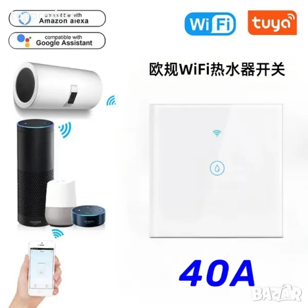 Смарт ключове за бойлер работещи с мобилното приложение Tuya. От приложението може да зададете програма за включване/изключване, таймер, включване/изключване от приложението и ключа.С контактно реле 40А достатъчно подсилено дори за бойлери до 8kw.Размерите са посочени на снимките.Налични в бяло и черно. Изпращаме с минус 27% от таксата на Еконт. Имате право да върнете закупената стока в рамките на 14 дни.Ключови думи: седмичен програматор за бойлер, WiFi ключ, Smart ключ.