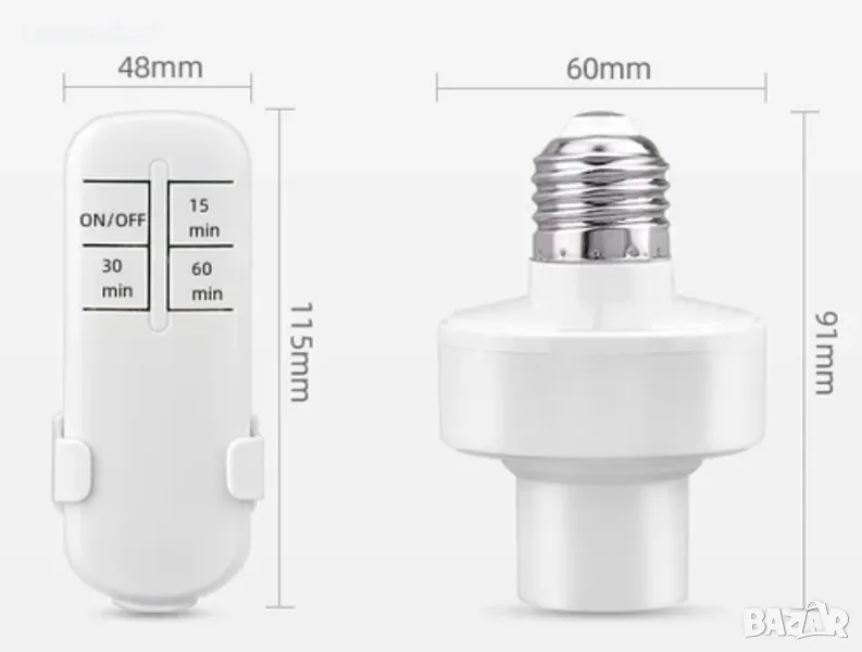 Фасунга с дистанционно и таймер за 15, 30 и 60 минути.- Обхват на дистанционното до 8 метра- За стандартна фасунга и лампа Е27;- За лампи до 20W, с нажежаема жичка до 50W;- Размерите са посочени на втората снимка. Изпращам с минус 27% от таксата на Еконт. Имате право да върнете закупената стока в рамките на 14 дни.