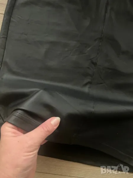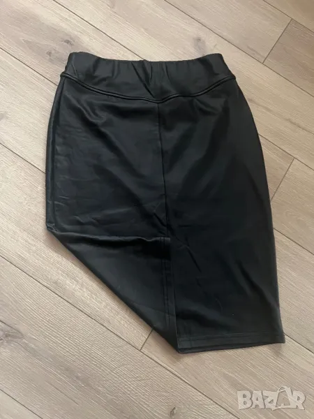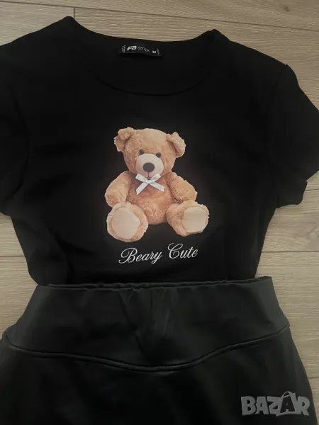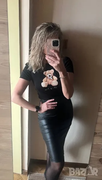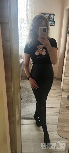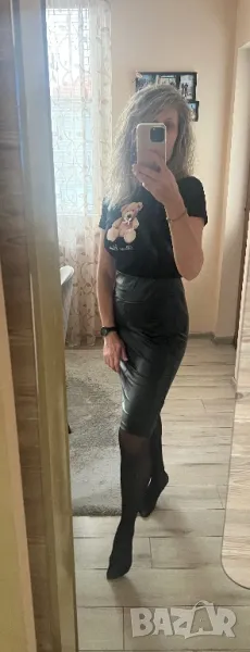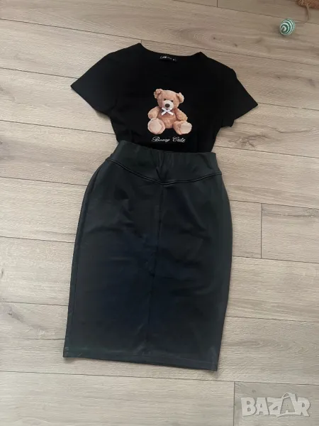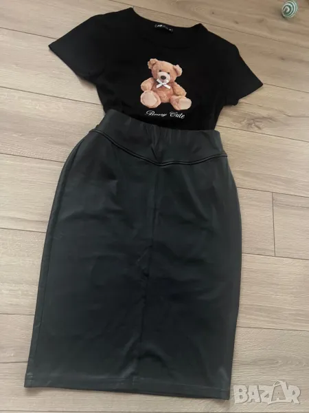 Материята на полата е тънка и мека, имитация на кожа. Талията е ластична. Тениската е скъсен модел. И двете са с еластичност. Обличани веднъж.