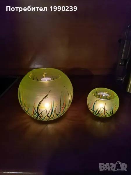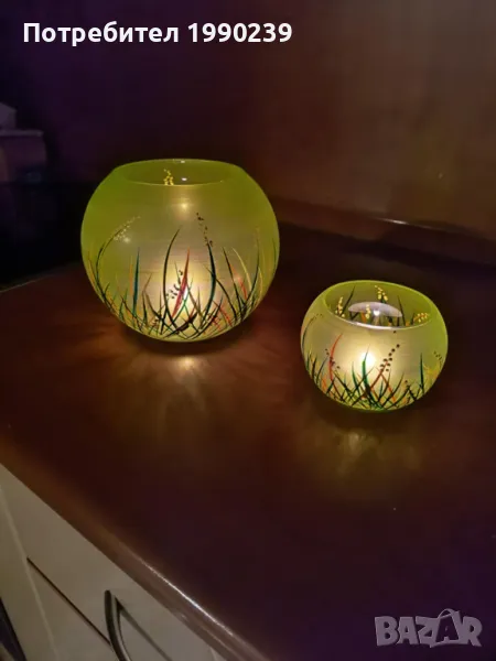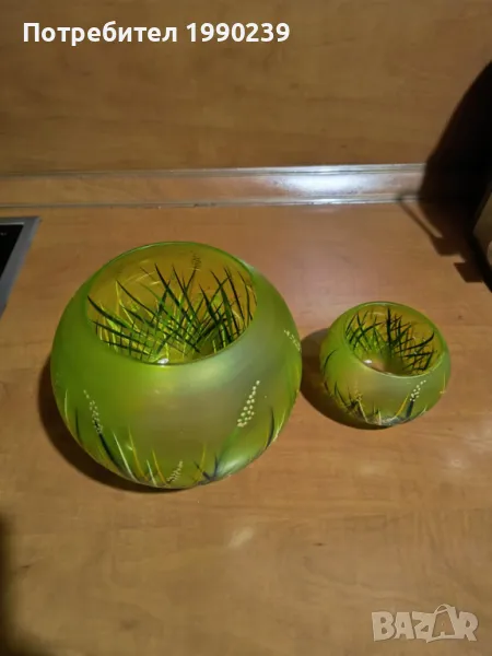Стъклени купи в идеално състояние от огнеупорно стъкло.Ръчно рисувани са. Със запалени свещички в тях могат да бъдат много ефектни. Размери: голямата е с височина 15 см., малката – 8 см. Обявената цена е за двете.