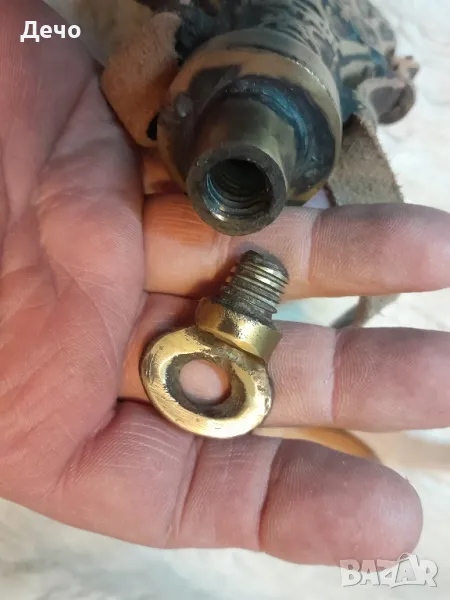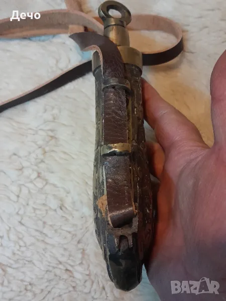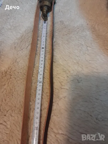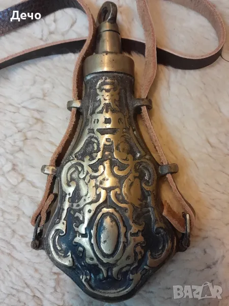 Масивна 0.7кг Месингова барутница в добро ,запазено и автентично състояние.С това кожено коланче върха на капачката идва на 25см от подмишницата при едър Човек дебело облечен .Изпраща се с една рапидка която новия собственик ще си постави в зависимост дали ще я ползва през рамо или с къса каишка на колан.Ако някой прецени че тази каишка му идва къса ...ще купя още една и ще я пратя с барутницата след уточнението.270 лв