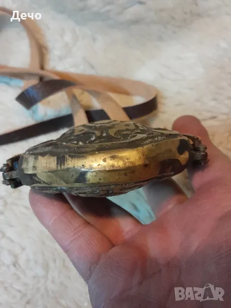 Масивна 0.7кг Месингова барутница в добро ,запазено и автентично състояние.С ново кожено коланче → Обява 48356409
