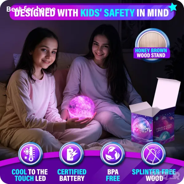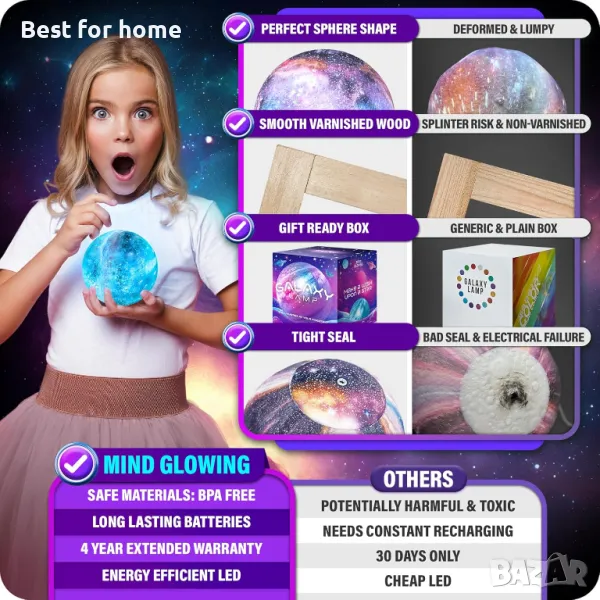 Перфектен подарък за мечтани нощи: Зарадвайте всяко момиче с лампата Galaxy, омагьосващ подарък, който превръща спалните в космически убежища. Проектиран внимателно, той включва хладни на допир светодиоди и дървена стойка без трески, предлагана в меденокафяво или игриво розово.