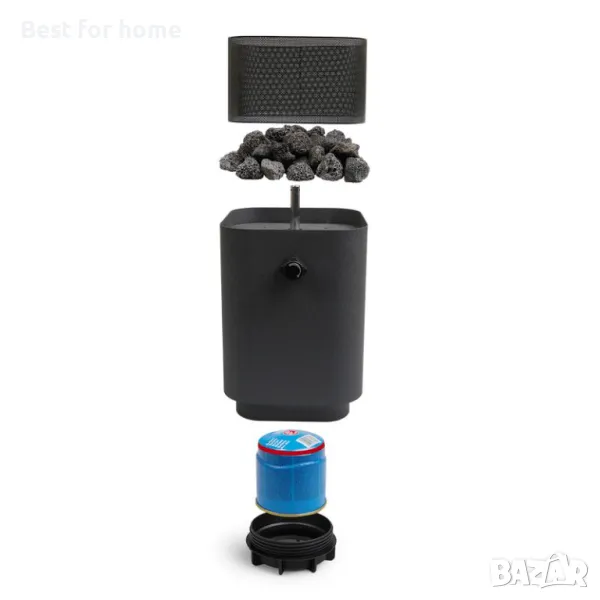 Няма място за лагерен огън, но искате да го затоплите? Този газов фенер може да бъде настроен за нула време и създава истинско настроение. Изработен е изцяло от метал, което му придава хладен и здрав вид. Благодарение на ясните линии, дизайнът остава вечен и подхожда на всеки стил. Включените камъни допълват цялото нещо. Можете лесно да регулирате пламъка с въртящото се копче. С него вашата тераса ще изглежда особено елегантна.