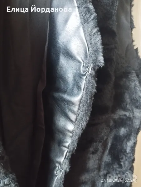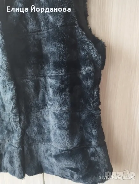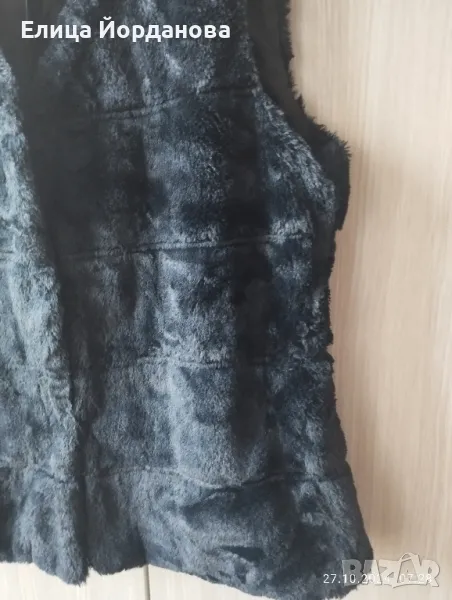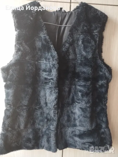 Ново меко черно елече на Есмара, имитация на кожа с косъм.Вътре е с подплата,закопчава се.Има и колан към елечето,който е отделен и ушички към елечето за него. Размер L, 44-46,но може да се носи и от дами XL,предвид това,че с колана може да се стегне,или да се носи и без него.Размери: цяла дължина на елечето 65 см.,от подмишницата до долу 40 см.Гръдна обиколка до 110 см.,талия до 105 см.