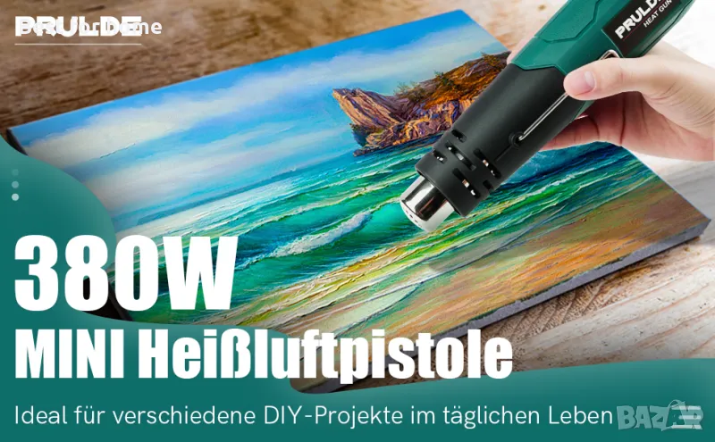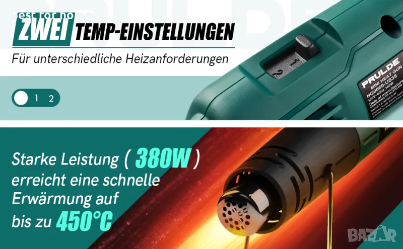 Силна производителност: мини топлинен пистолет с 380 W загрява бързо до максимална температура от 450 °C.