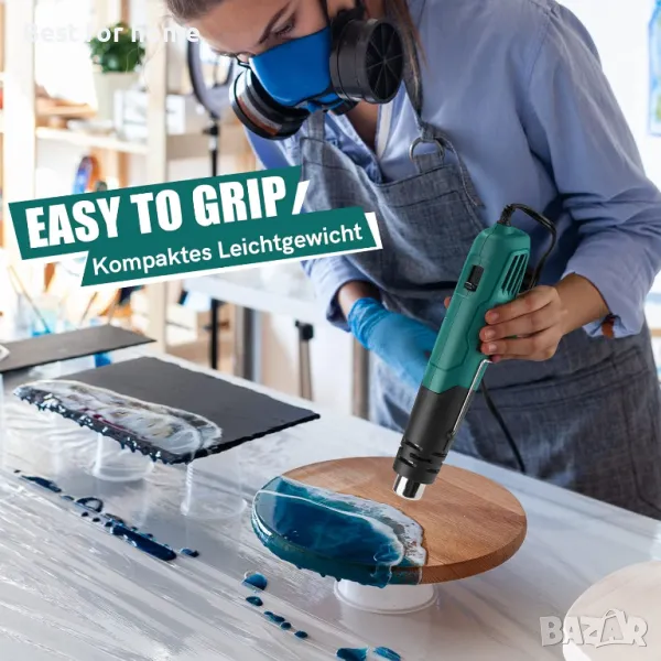 пистолет за горещ въздух (0,35 кг) е снабден с неплъзгаща се изпъкнала част, която осигурява по-малко умора по време на употреба. Вградената скоба позволява стабилна стойка за работа със свободни ръце, а 2M кабелът може да се движи гъвкаво в голяма площ.