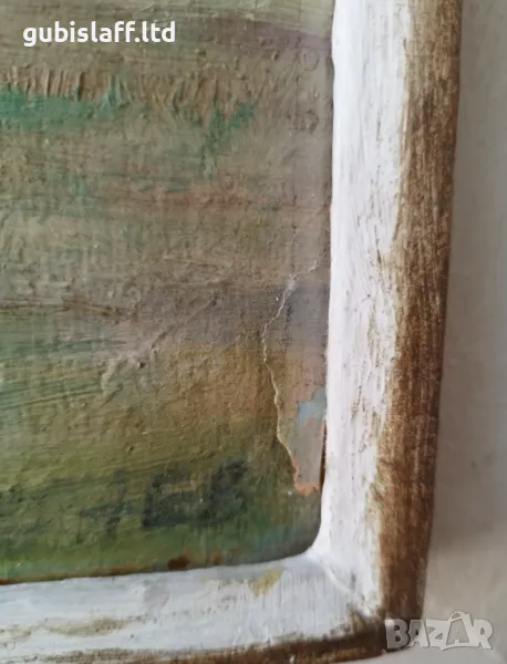 Картонът е леко "изгърбен" от годините, долу вдясно има отлюспено парче, но не е паднало.