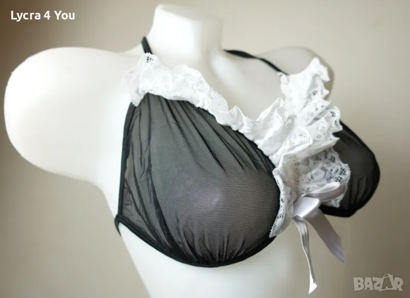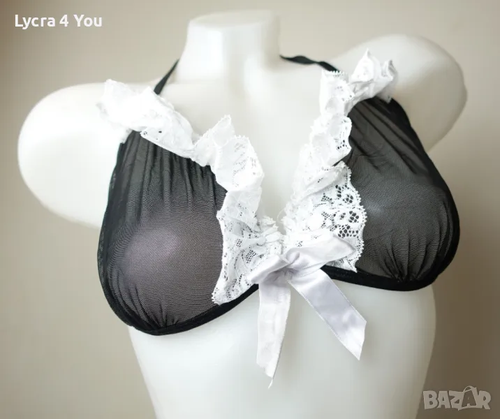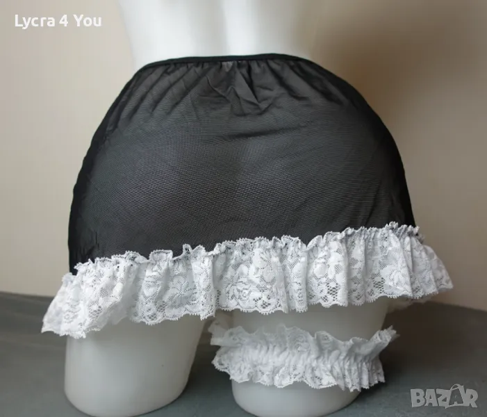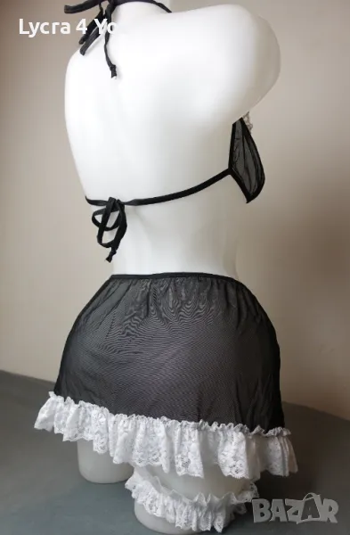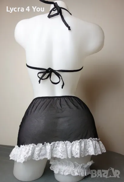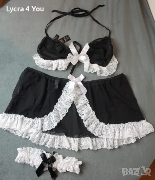 Дамски еротичен комплект "домашна помощница" от 3 части: включва тюлена черна прозираща пола с бяла дантела, тюлен сутиен с бяла дантела и връзки на врата и гръб, както и жартиер за крак с бяла дантела и черна сатенена панделка.