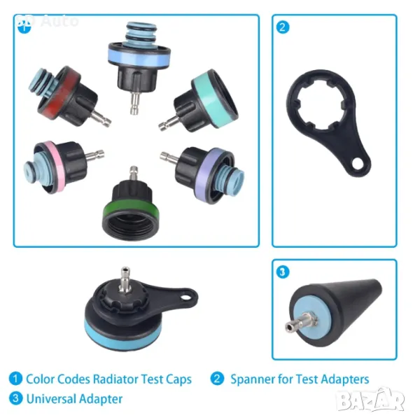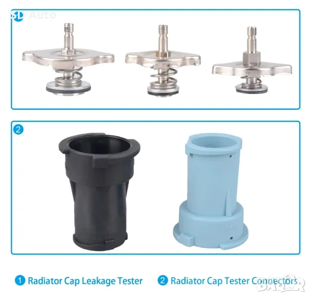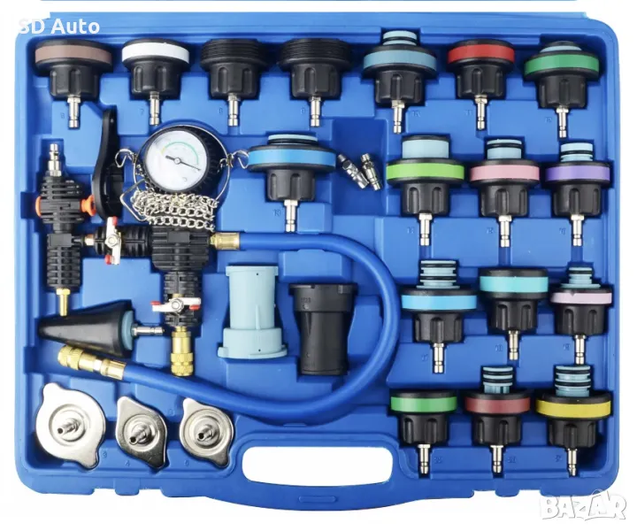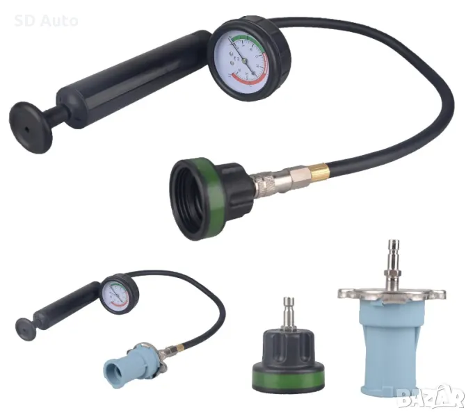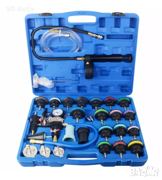 Тестер за охладителна система , за течове на радиатора и вакуумно налягане.Тестерът за охлаждаща система е идеален комплект за тестване на налягането на охладителната система и уплътнителните капачки. Нашият продукт ви позволява бързо да откриете течове в охладителната система, напр. уплътнение на главата на цилиндъра, охладителни модули, водни помпи, маркучи и др.