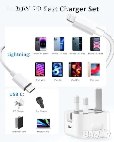 Ново Компактно USB C английско зарядно 20W + кабел за Apple устройства Айфон