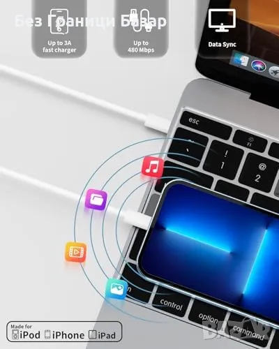 Висококачествен кабел: MFi сертифициран, с 480 Mbps скорост на трансфер и издръжливост при 15,000+ сгъвания.