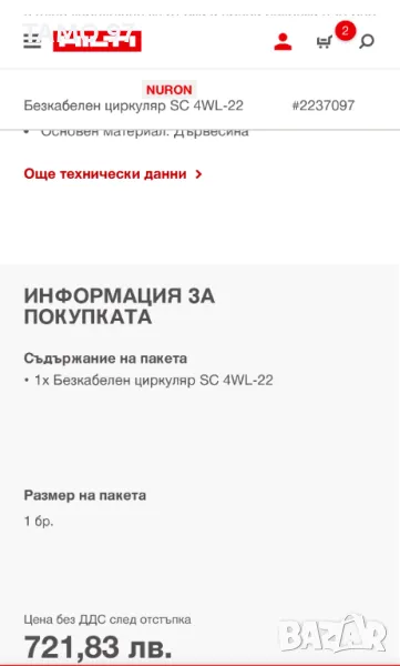 Продавам акумулаторен ръчен циркуляр на Хилти от новата Nuron серия. Машината е в отлично визуално състояние и работи перфектно без никакви забележки, внос от Франция. Обявената цена е за само бодито без батерии и зарядно. При желание на клиента може да се окомплектова с 2 батерии и зарядно за 1000лв. Пращаме с опция преглед и тест с куриерска фирма еконт може и лично предаване за гр. Шумен. Магазинската цена е: 721лв БЕЗ ДДС (С ДДСТО е 865лв)