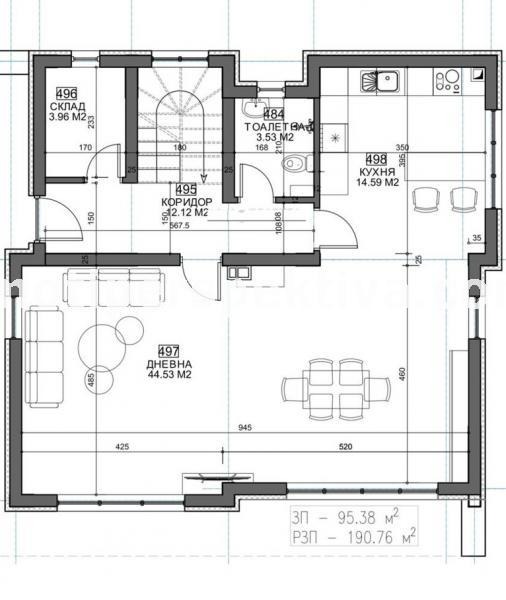 1етаж-голям хол с трапезария и кухня, веранда, коридор, килер, тоалетна.