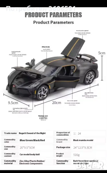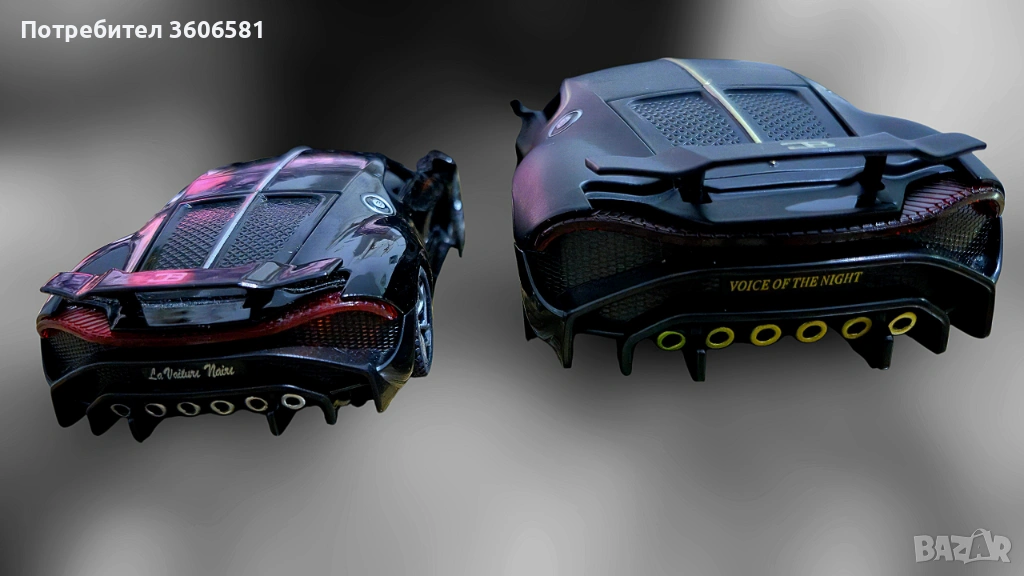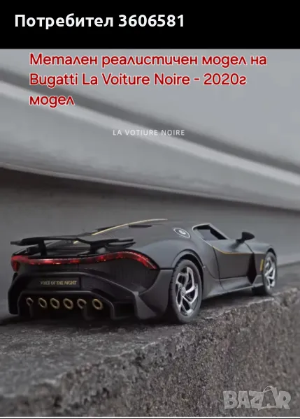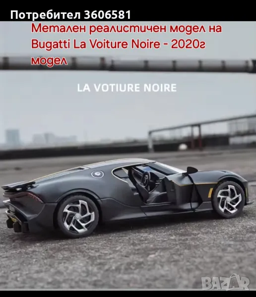 Метални модели на спортни автомобили играчки детаилни и реалистичени на спортните коли Bugatti La Voiture Noire в съотношение 1:24 и 1:32 спрямо релния размер на колата. Включени батерии за колите . При дърпане назад, след пускане се движи напред самостоятелно, отварящи се врати и капаци, светещи стопове и фарове, звук на двигателя при тръгване и спирачки. Подходящ подарък за деца или колекционери на умалени и реалистични модели на спортни автомобили.