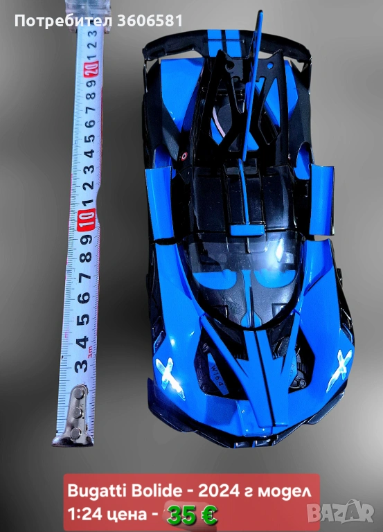 1. Bugatti Bolide модел от 2024г в мащаб 1:24 / 20,5 д х 9 ш х 4,5 в СМ/