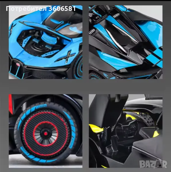 Метални модели на спортни автомобили играчки детаилни и реалистични на спортната кола Bugatti Bolide в съотношение 1:24 спрямо релния размер на колата . Включени батерии за колите . При дърпане назад, след пускане се движи напред самостоятелно, отварящи се врати и капаци, светещи стопове и фарове, звук на двигателя при тръгване и спирачки, при натискане на клаксона на волана се чува звук от клаксона. Подходящ подарък за деца или колекционери на умалени и реалистични модели на спортни автомобили.