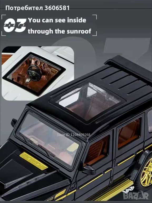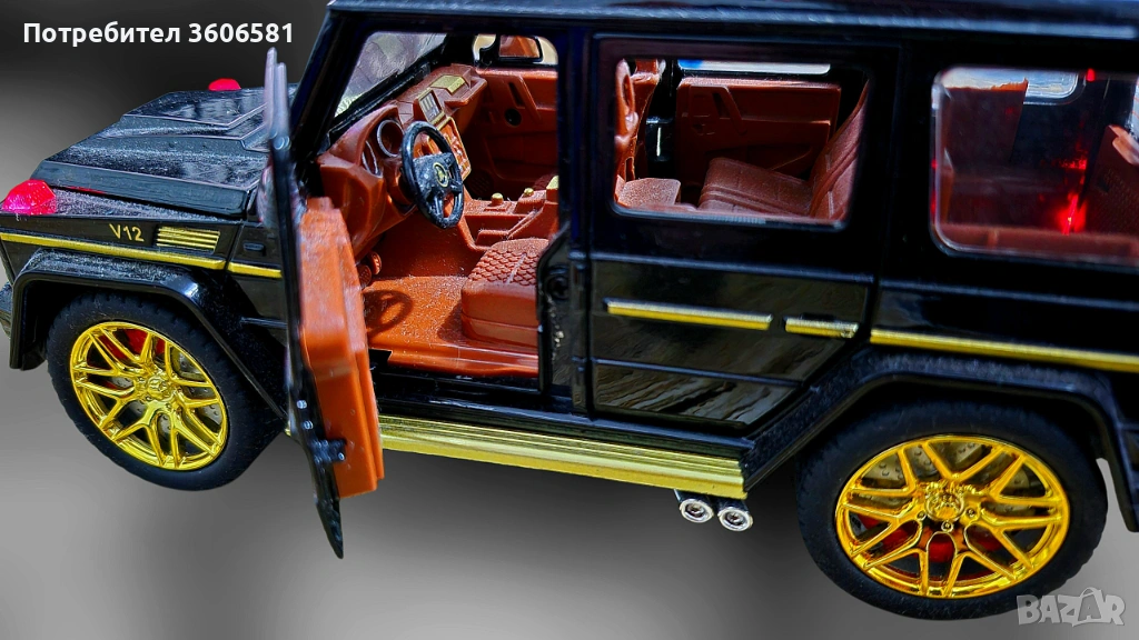 - Mercedes Benz G Klassa Включени батерии за колата . При дърпане назад, след пускане се движи напред самостоятелно/посредством навиваща се пружина в двигателя/, отварящи се врати и капаци, светещи стопове и фарове, звук на двигателя при тръгване и спирачки, звук при натискане на клаксона на Волана на G Klassa джипа. Подходящ подарък за деца или колекционери на умалени и реалистични модели на автомобили.