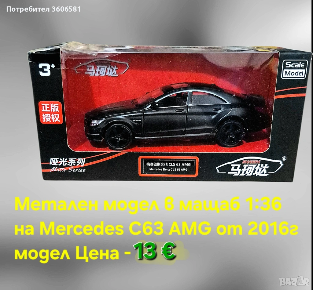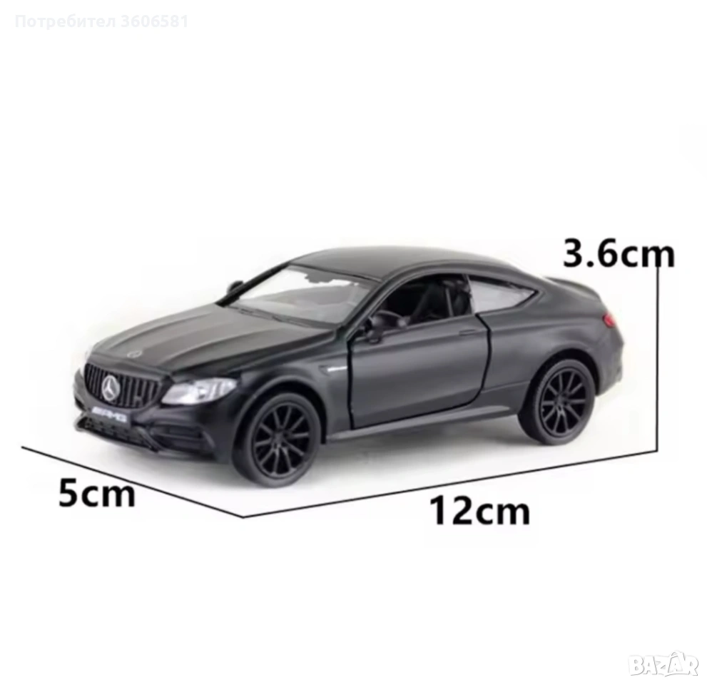 1. Mercedes C63 AMG oт 2016г в мащаб 1:36 /12,5 д х 5 ш х 3 в СМ //дължина, ширина , височина в см/ Цена - 13 €