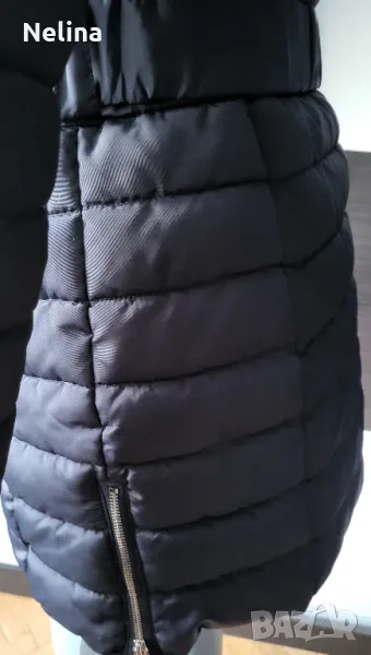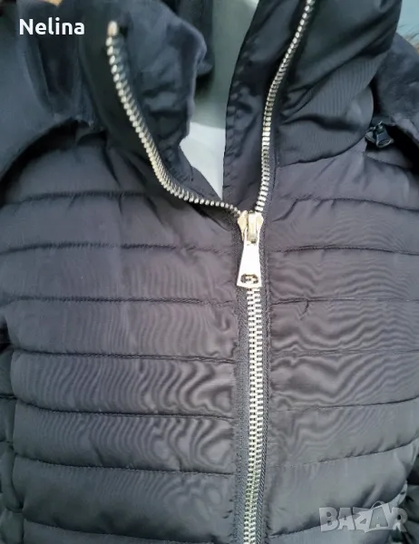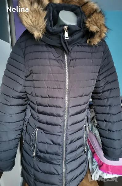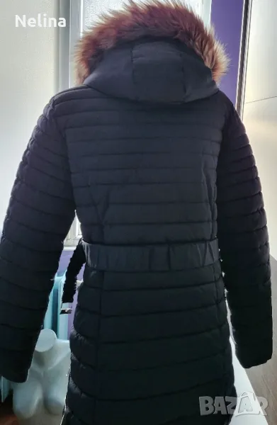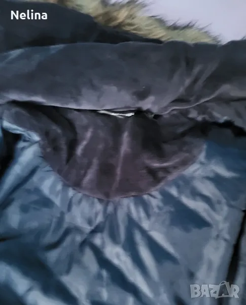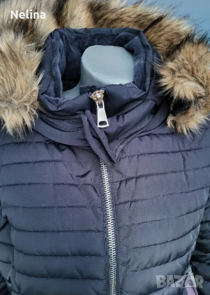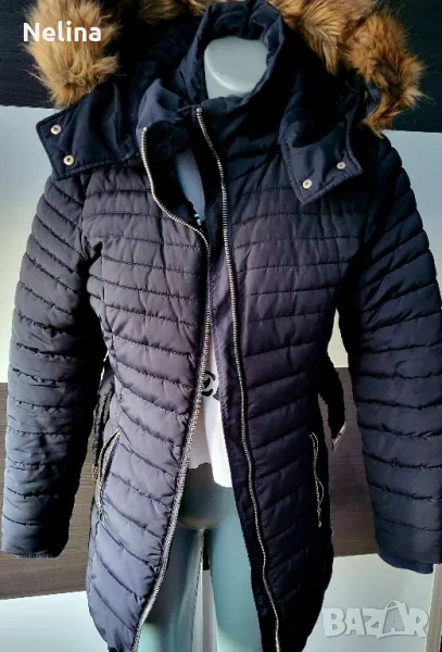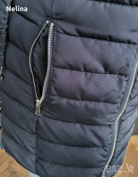 Много топло яке,тъмно син цвят,с джобове,качулка(сваля се),колан.Обличано е 3,4 пъти.