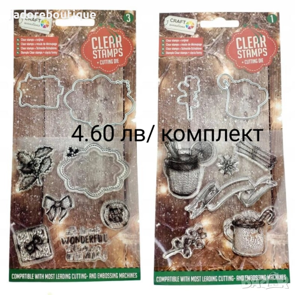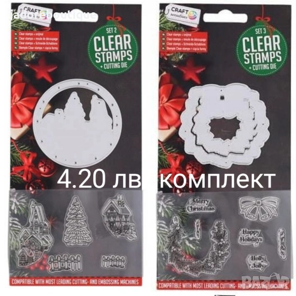 Цените са написани на снимките. Тези от първата снимка са по 4.60 лв/ комплекта. На втората снимка са по 4.20 лв/ комплект.Щанците за рязане и релеф могат да се използват с повечето машини за рязане и релеф на различните търговски марки. С тях можете да изрежете различни форми от хартия, картон, филц, текстил, микропореста гума EVA, бирен картон, фолио и други. Подходящи са за изработка на картички, декорация на албуми за снимки и за други декоративни и приложни техники.