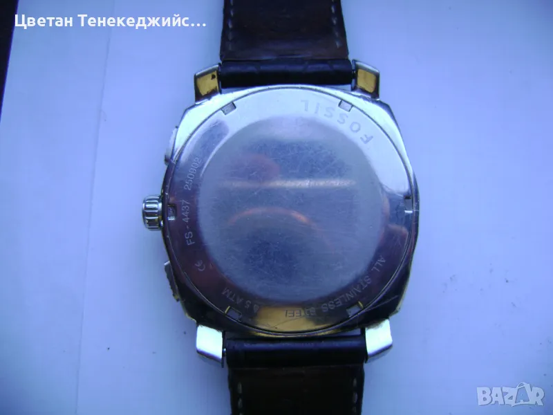 3.Кварцов часовник Fossil Chronograph.Работи точно.Датник.Всички малки стрелки работят без липсващата на 9 часа.Водоустойчив 5 атм.Диаметър на касата без коронката 45,6мм.Ширина между лъговете 24мм.Каишка естествена кожа.-65лв.