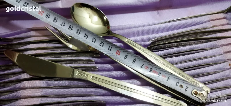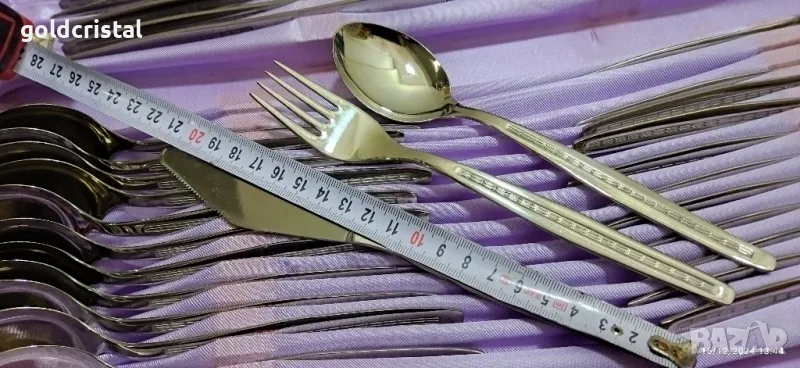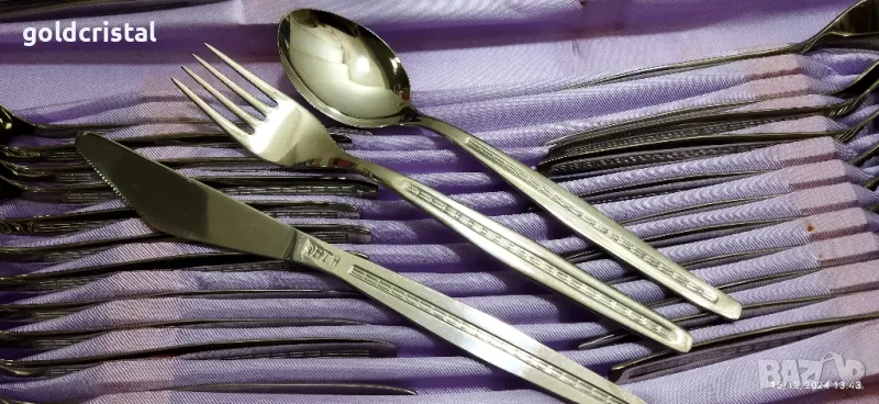 ретро български прибори за хранене неръждаеми маркирани Велико Търново неизползвани в кутия 60 части ножове вилици лъжици десертни вилички и лъжички по 12бр от вид сервиз комплект сет лот ретро арт декор винтидж колекция стари старинни антикварни предмети обзавеждане за дома и семейството