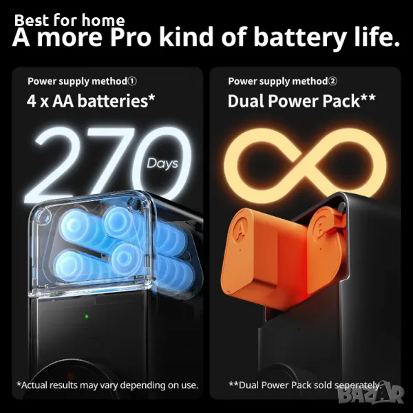 Много дълъг живот на батерията: С 4 бр. 1,5 V AA батерия (включена в кутията) се постига живот на батерията до 6-9 месеца (в зависимост от употребата). SwitchBot Dual Power Pack може също да бъде закупен за удължаване на живота на батерията до 9-12 месеца. (Сменете батерията веднага щом се покаже съобщението за изтощена батерия).