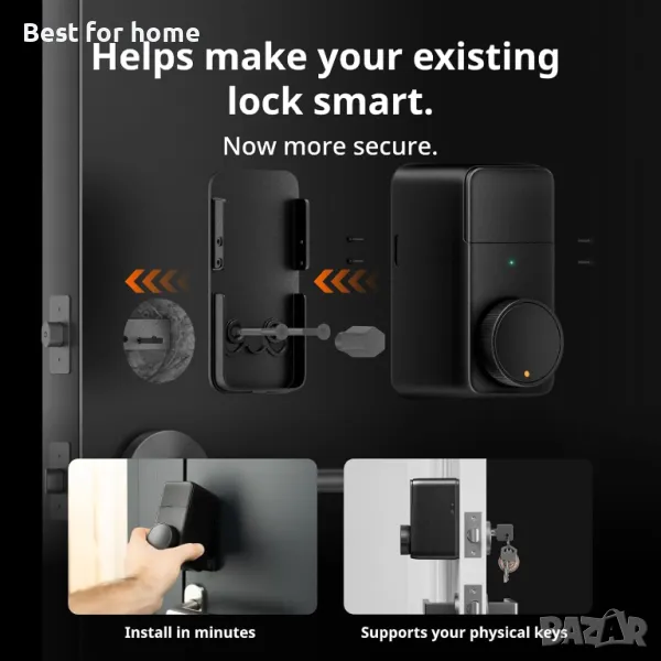 Подобрена съвместимост: Корпусът е изработен от алуминиева сплав, която осигурява по-здрав и издръжлив дизайн. Нашата интелигентна брава с възможност за надграждане и може да се монтира без необходимост от пробиване на дупки, позволява лесен и бърз монтаж на ключалката на вашата врата, без да се повреди съществуващата ключалка. В рамките на ЕС: Lock Pro е съвместим с европейски цилиндри, британски овални цилиндри, швейцарски кръгли цилиндри и цилиндри с бутони. Забележка: Моля, проверете съвместимостта преди покупка.