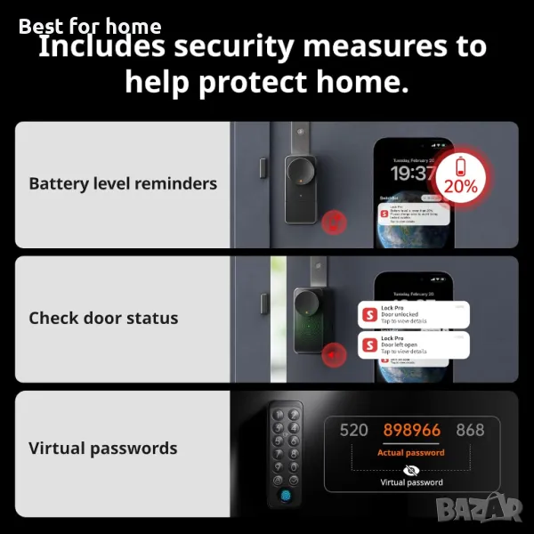 Автоматично заключване и известия в реално време: С автоматично заключване ключалката автоматично се заключва, когато излизате или влизате в къщата. В допълнение, Lock Pro може да докладва състоянието на ключалката на вратата и общото състояние на вратата в реално време. Регистрациите за устройството могат да бъдат проверени чрез приложението по всяко време, за да получите преглед на броя на вратите и затварянията, като използвате методи и хора.
