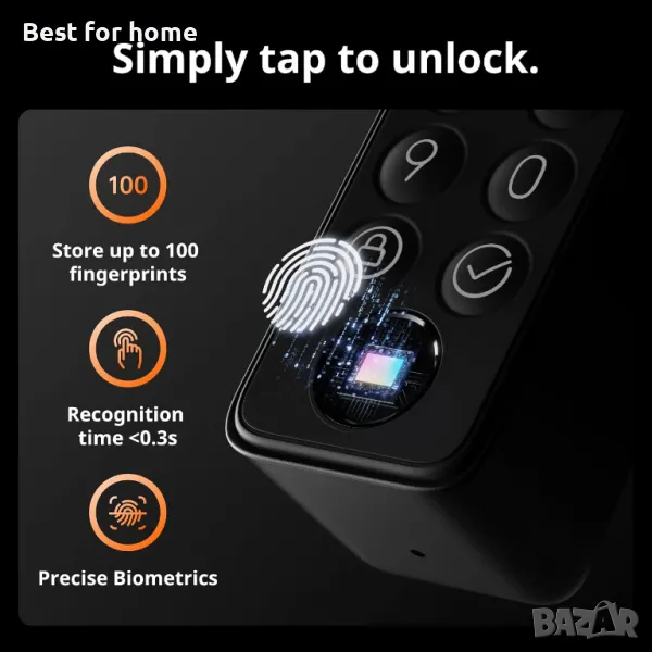 До 15 метода за отключване: Keypad Touch предлага разширено разпознаване на пръстови отпечатъци с бърза скорост на откриване от по-малко от 0,3 секунди и точност до 98%. Могат да се съхраняват до 100 записа. Обхват на доставка: За отключване могат да се използват различни настройки за пръстов отпечатък и парола, дори гласови команди, Apple Watch или NFC карта. Има за всеки по нещо.