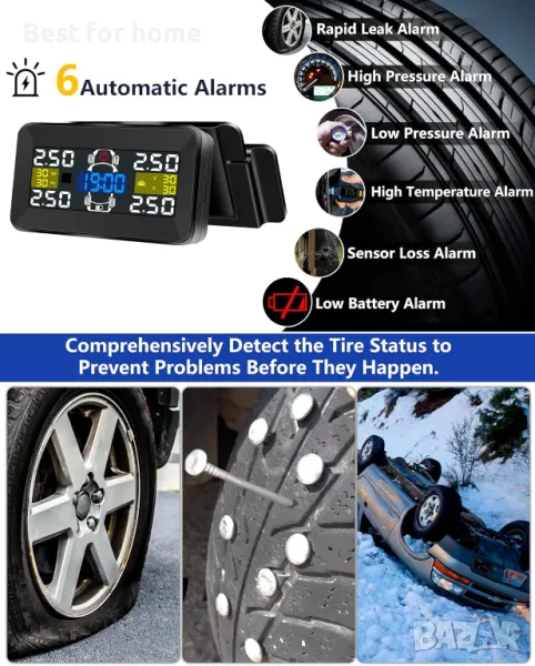 6 режима на аларма и персонализирани стойности на аларма: Системата за контрол на налягането в гумите TPMS е с 6 режима на аларма (аларма за теч, аларма за високо/ниско налягане, аларма за висока температура, аларма за изтощена батерия и аларма за повреда на сензор), гума в реално време. Мониторинг на налягането, осигурява визуално. Обичайни и звукови аларми при необичайни условия. Подобреният TPMS поддържа настройката на различни алармени стойности за налягането в гумите за предни и задни гуми, което е най-добрият помощник при шофиране.