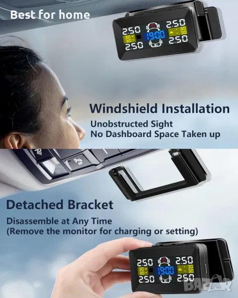 1. Системата за следене на налягането в гумите TPMS може да се монтира на предното стъкло, без да блокира изгледа. Дизайнът на подвижната скоба е удобен за сваляне на монитора за зареждане.